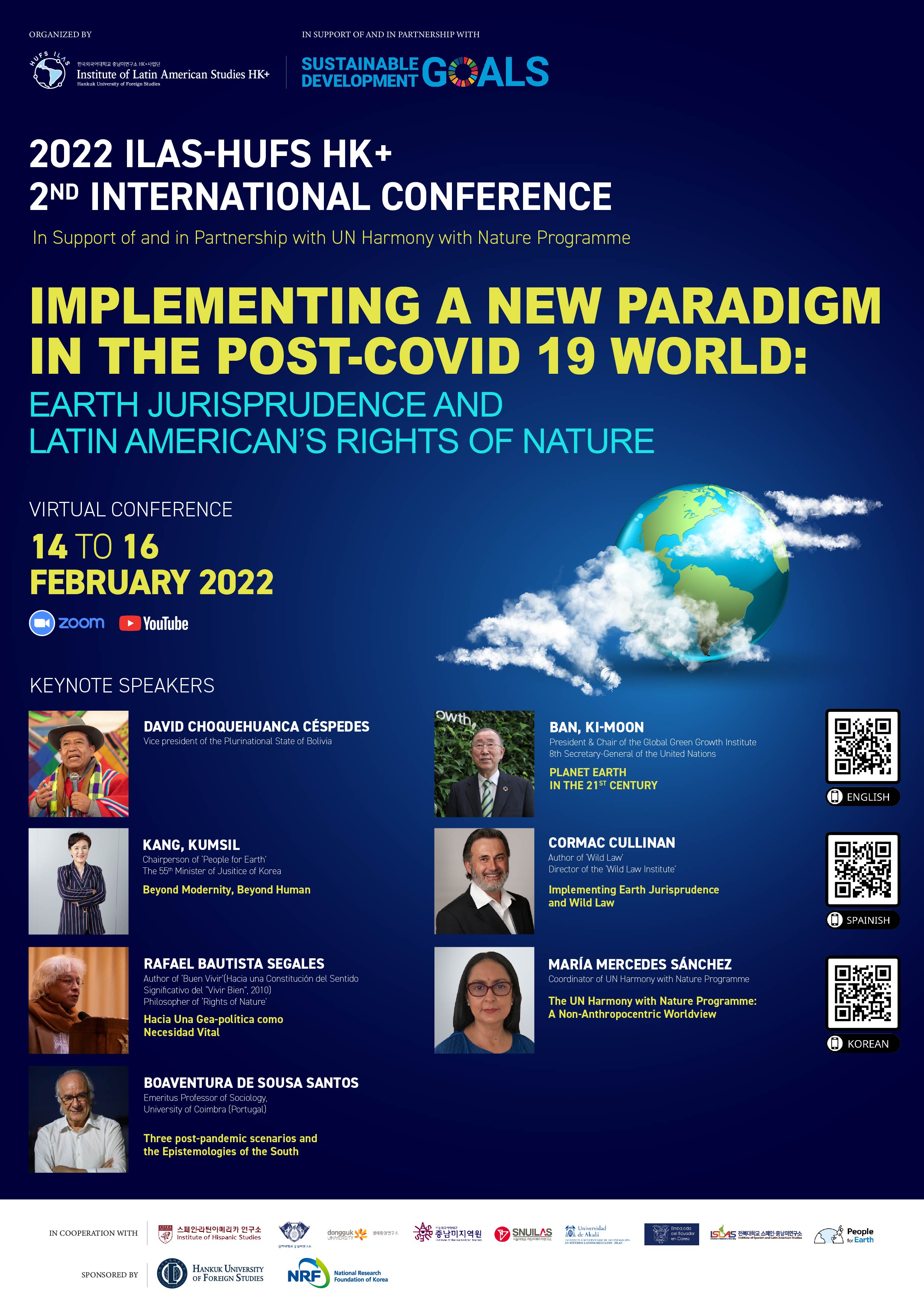 한국외대 중남미연구소 HK+사업단(사업단장 전용갑 교수)은 2022.2.14-2.16 3일간 “포스트 코로나 시대의 대안 세계관: 지구법학과 라틴아메리카의 자연권”을 주제로 줌과 유튜브를 통해 비대면 국제학술대회를 개최한다. 이번 국제학술대회는 아시아에서는 최초로 ‘지구 법학(Earth jurisprudence)’과 ‘자연권(Rights of Nature)’을 주제로 열리는 대규모 학술행사이다. 코로나19 팬데믹으로 고조된 전 세계적 생태환경 위기를 반영하듯, 이번 학술대회에는 6개 대륙 30개국에서 183명의 학자(기조강연 7, 발표 139, 좌장 37)가 참가하여 ‘자연과의 조화’ 속에서 인류의 현재와 미래의 지속 가능한 발전방안과 코로나19 이후의 대안적 세계관을 모색한다.