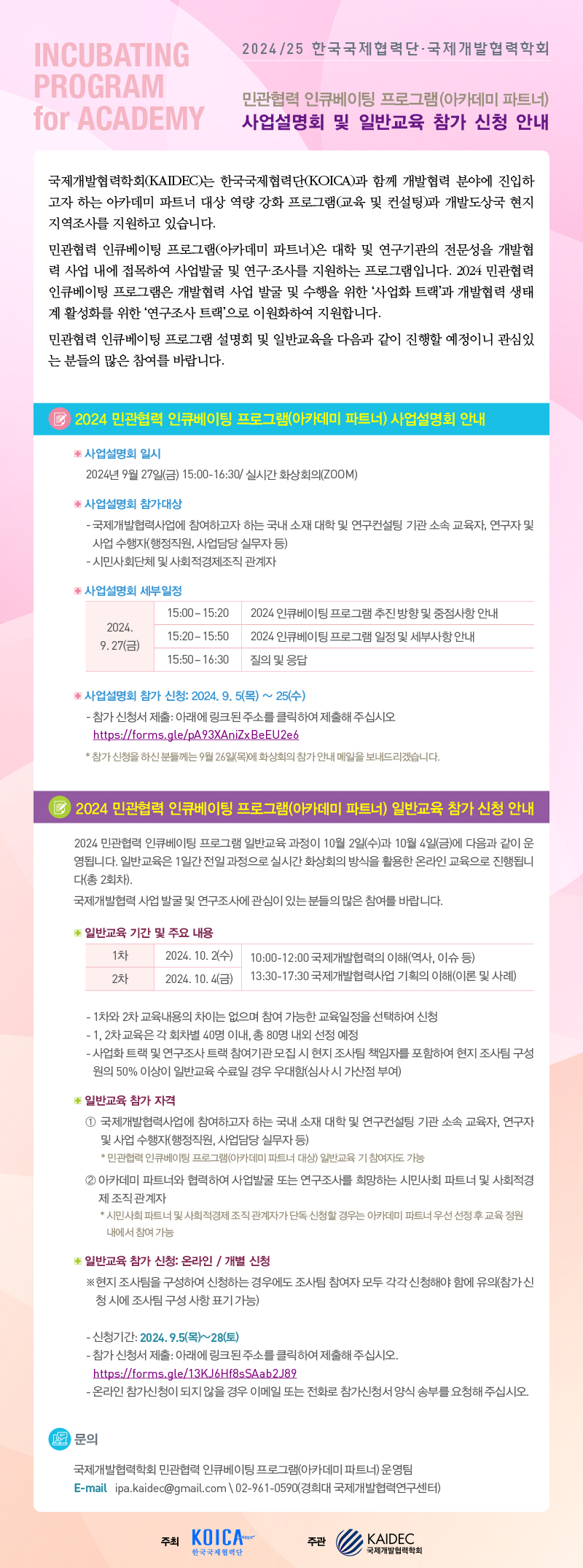 귀 학회의 회원들이 개발협력 사업 수행 및 현장 기반 연구·조사에 참여할 수 있도록 민관협력 인큐베이팅 프로그램(아카데미 파트너) 사업설명회 참가 관련 홍보를 요청드립니다.