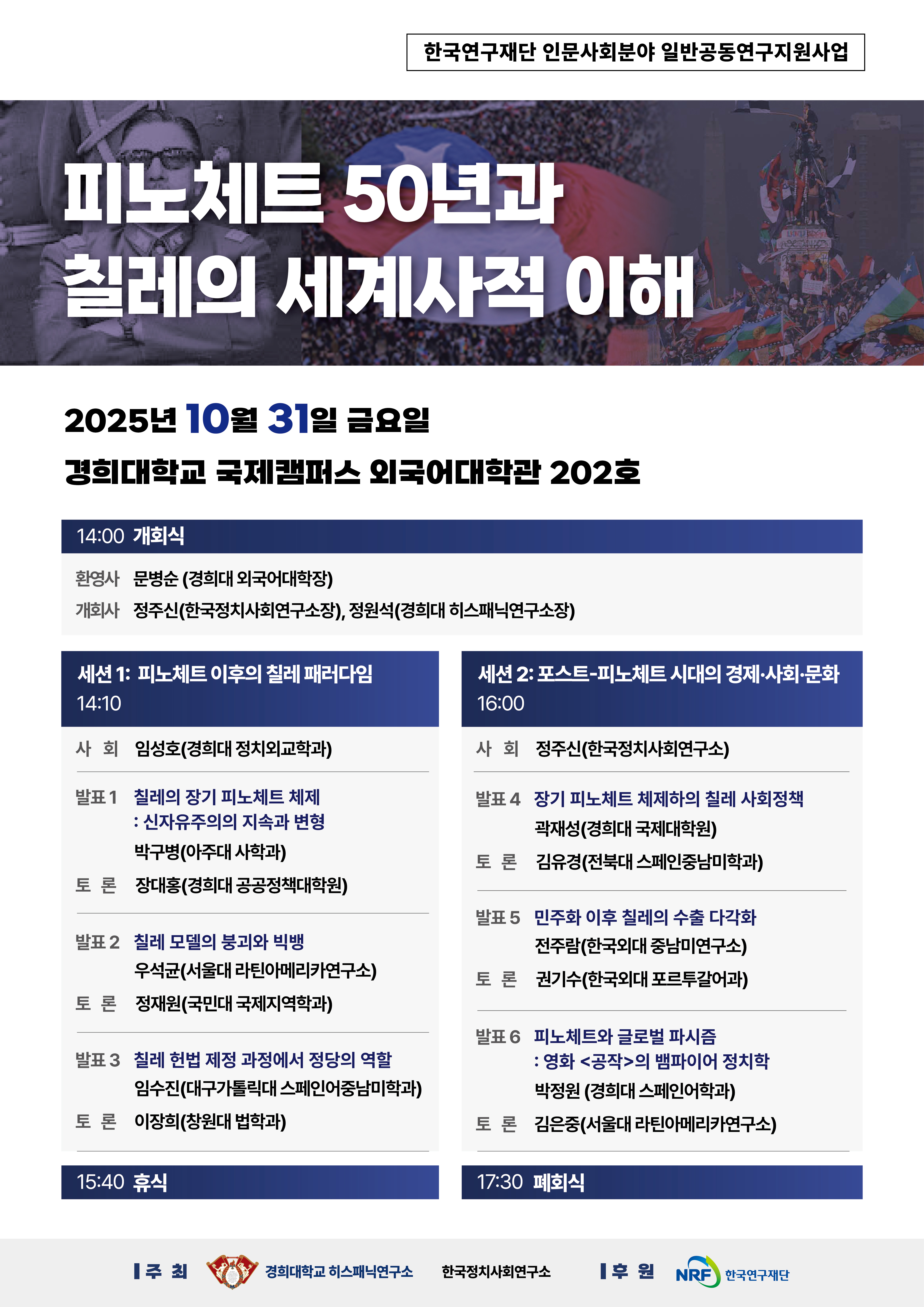 경희대히스패닉연구소와 한국정치사회연구소는 공동으로 칠레 쿠데타 50년이 되는 2023년을 기점으로 전개된 다양한 사회적, 학문적 논의를 한국 학술장에 소개하고자 합니다.