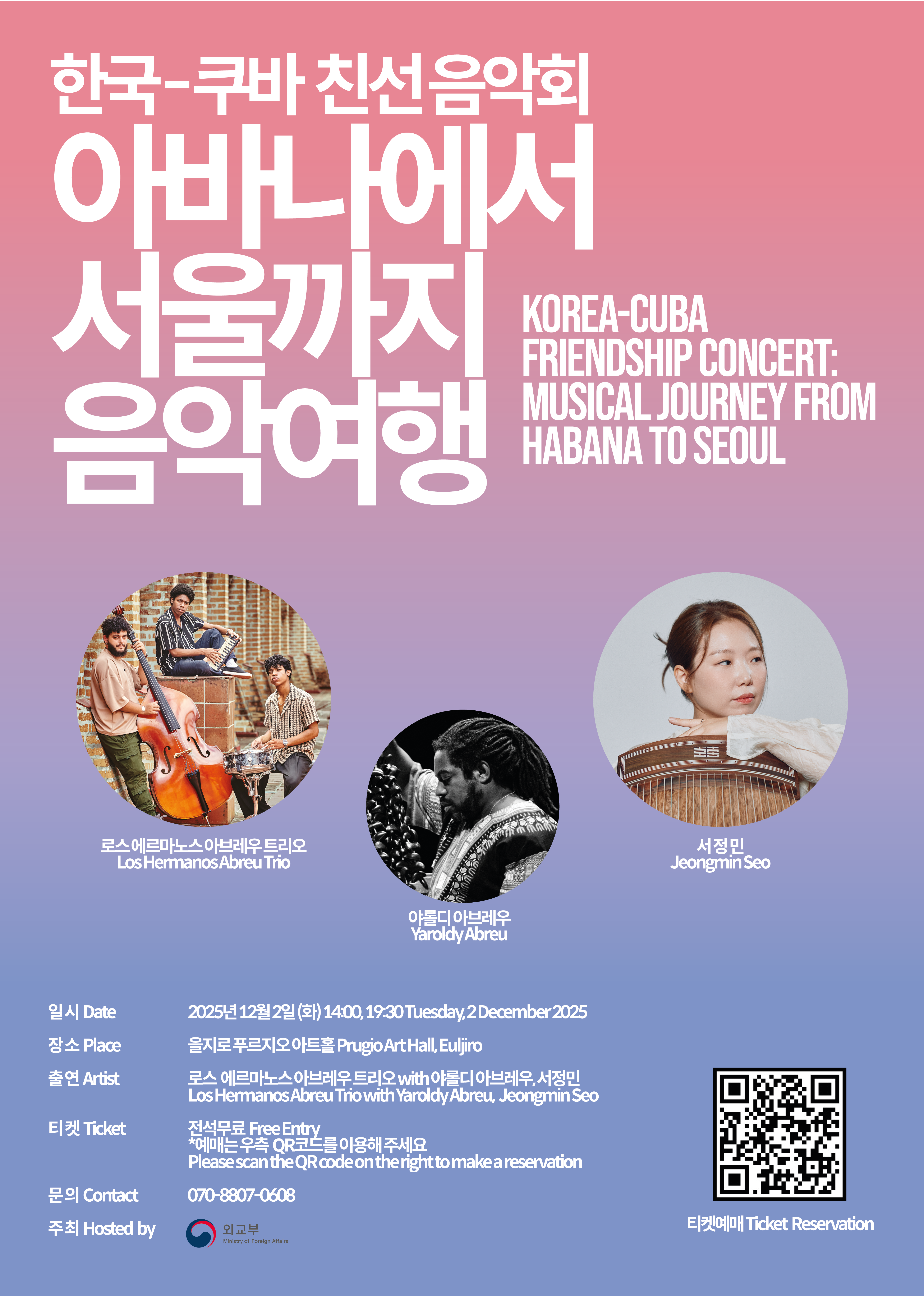 외교부 중남미국에서 아래의 포스터와 같이 오는 12월 2일 화요일 한국–쿠바 친선 음악회를 개최합니다.